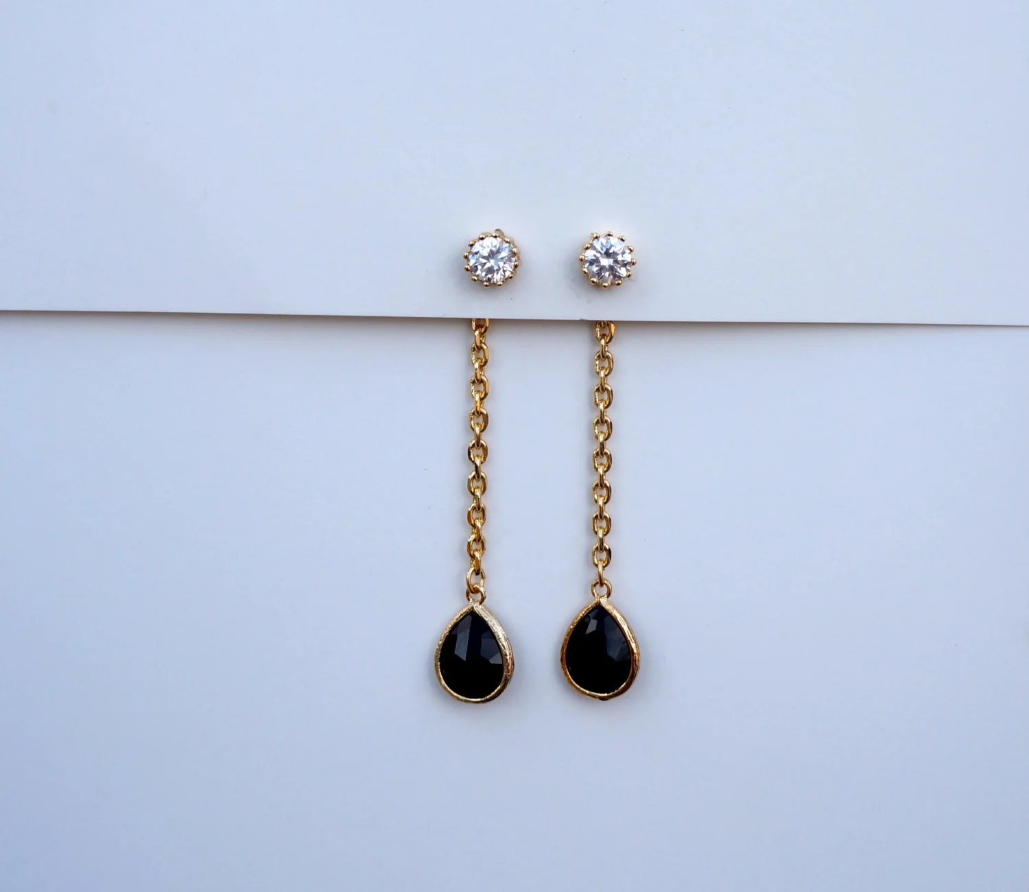 This listing is for one pair of diamond studs with hanging black glass drops (other additional earring in photos are sold separately)