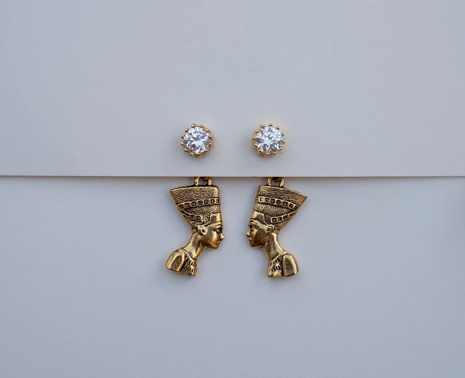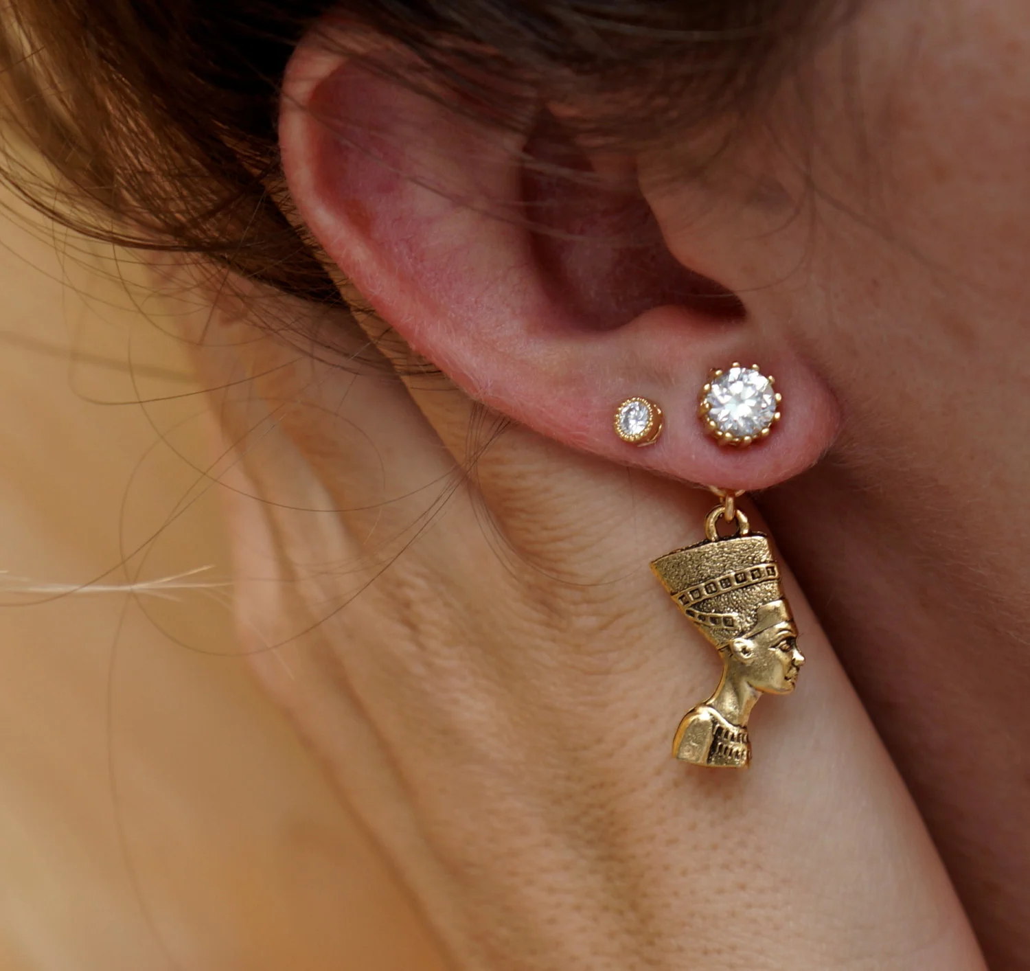 This listing is for one pair of diamond studs with Nefertiti charms (other additional earring in photos are sold separately)