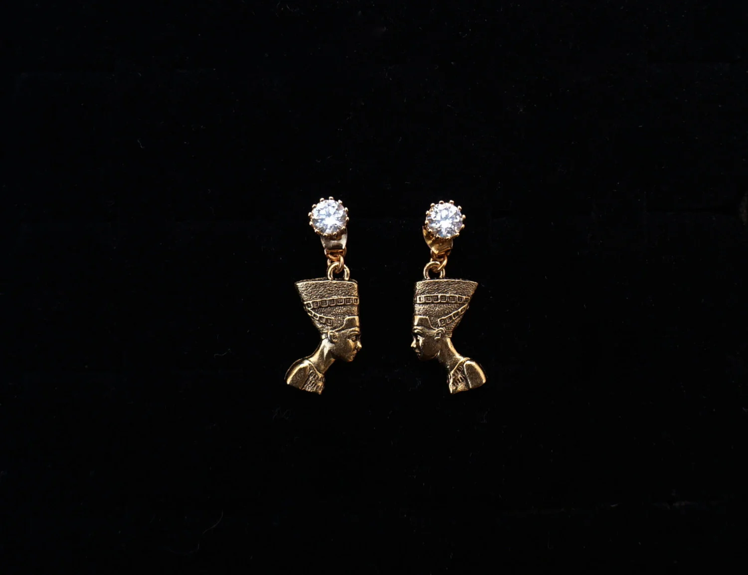 -a beautifully detailed Nefertiti charm that hangs from the back of the ear nut to give these diamond studs a unique and different look.