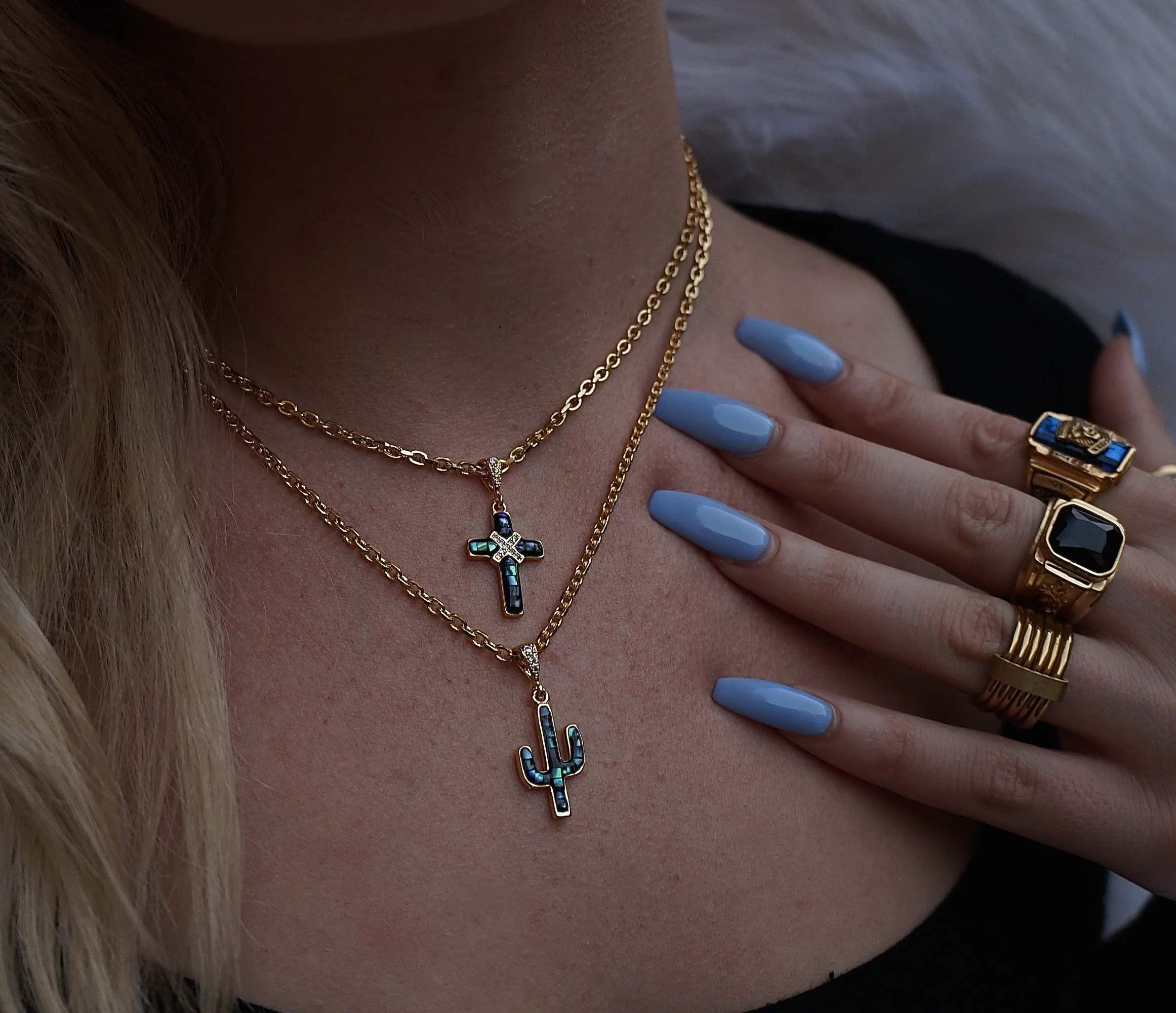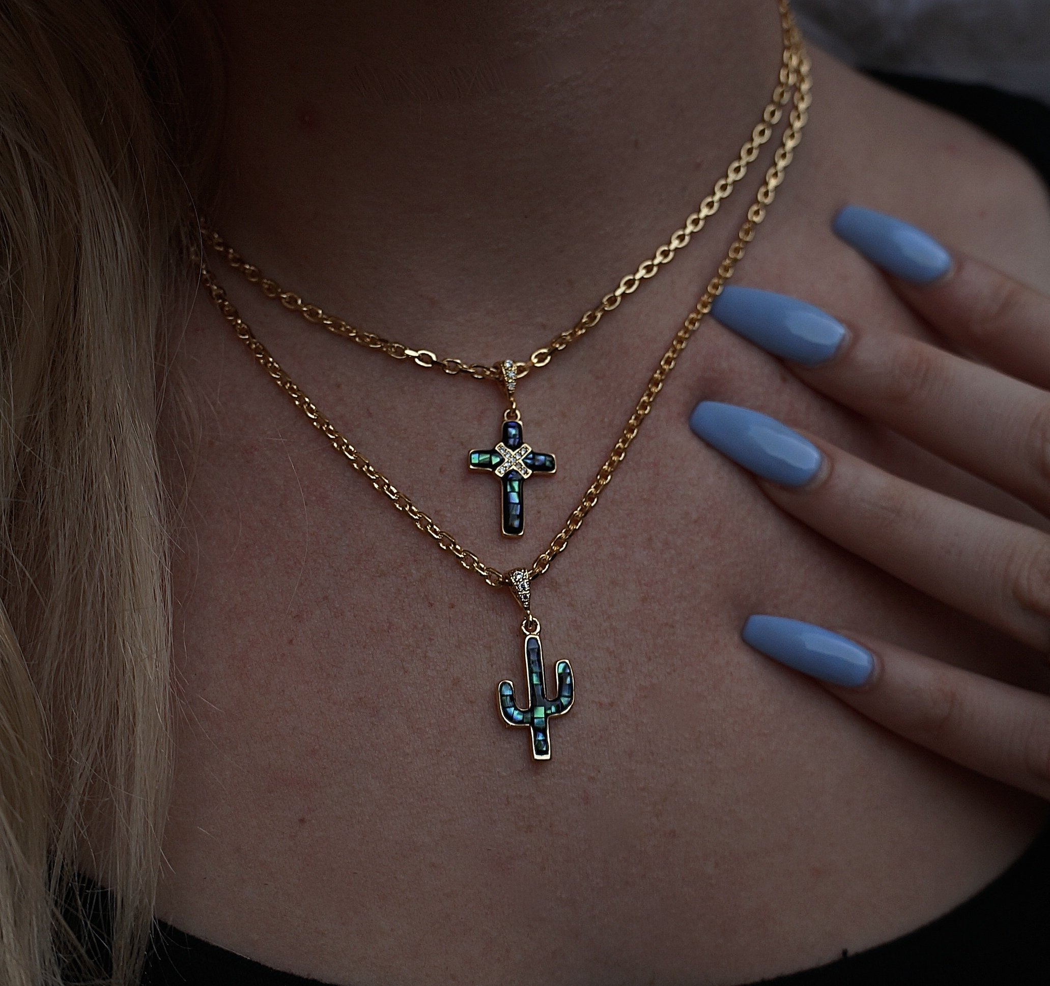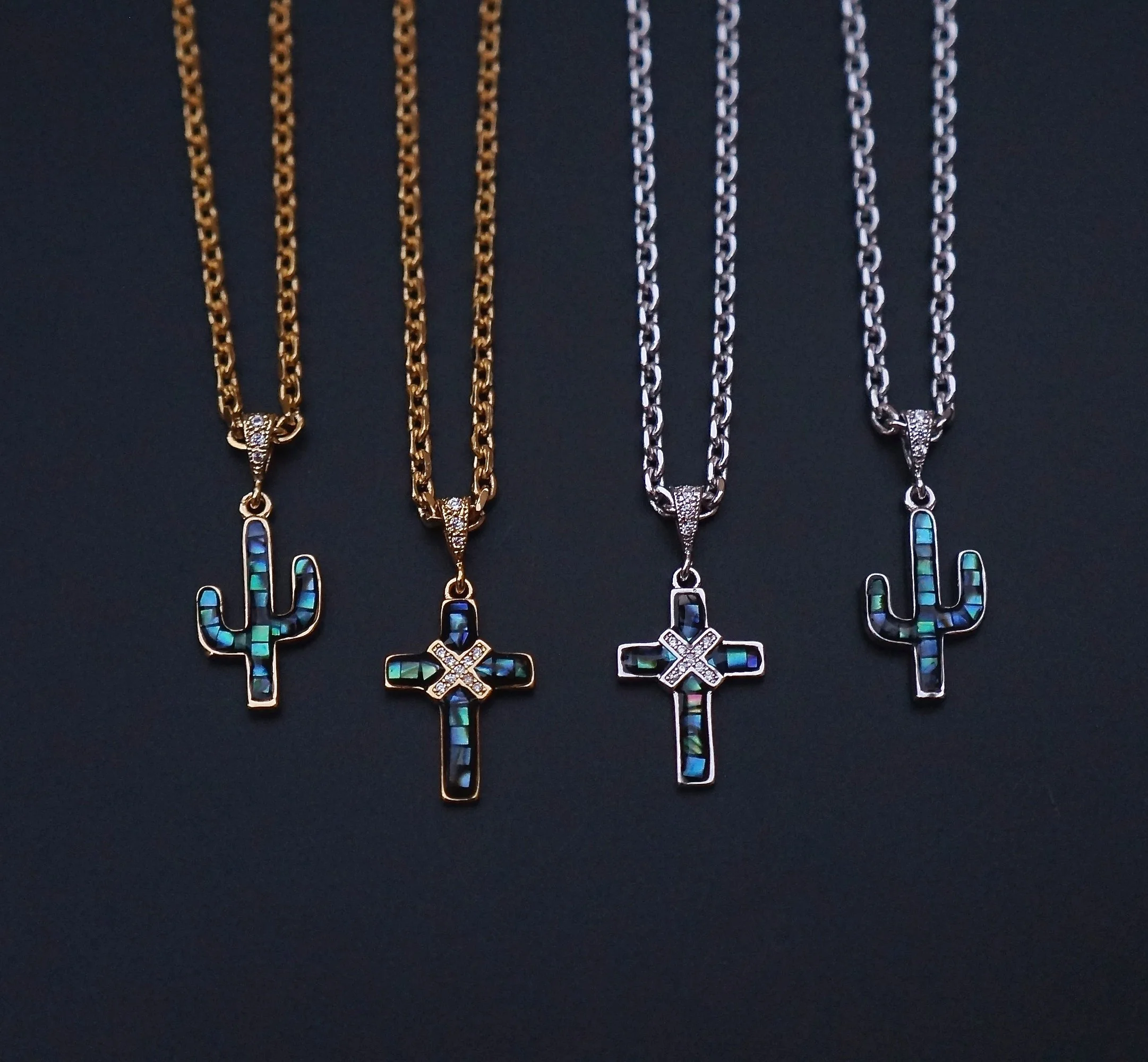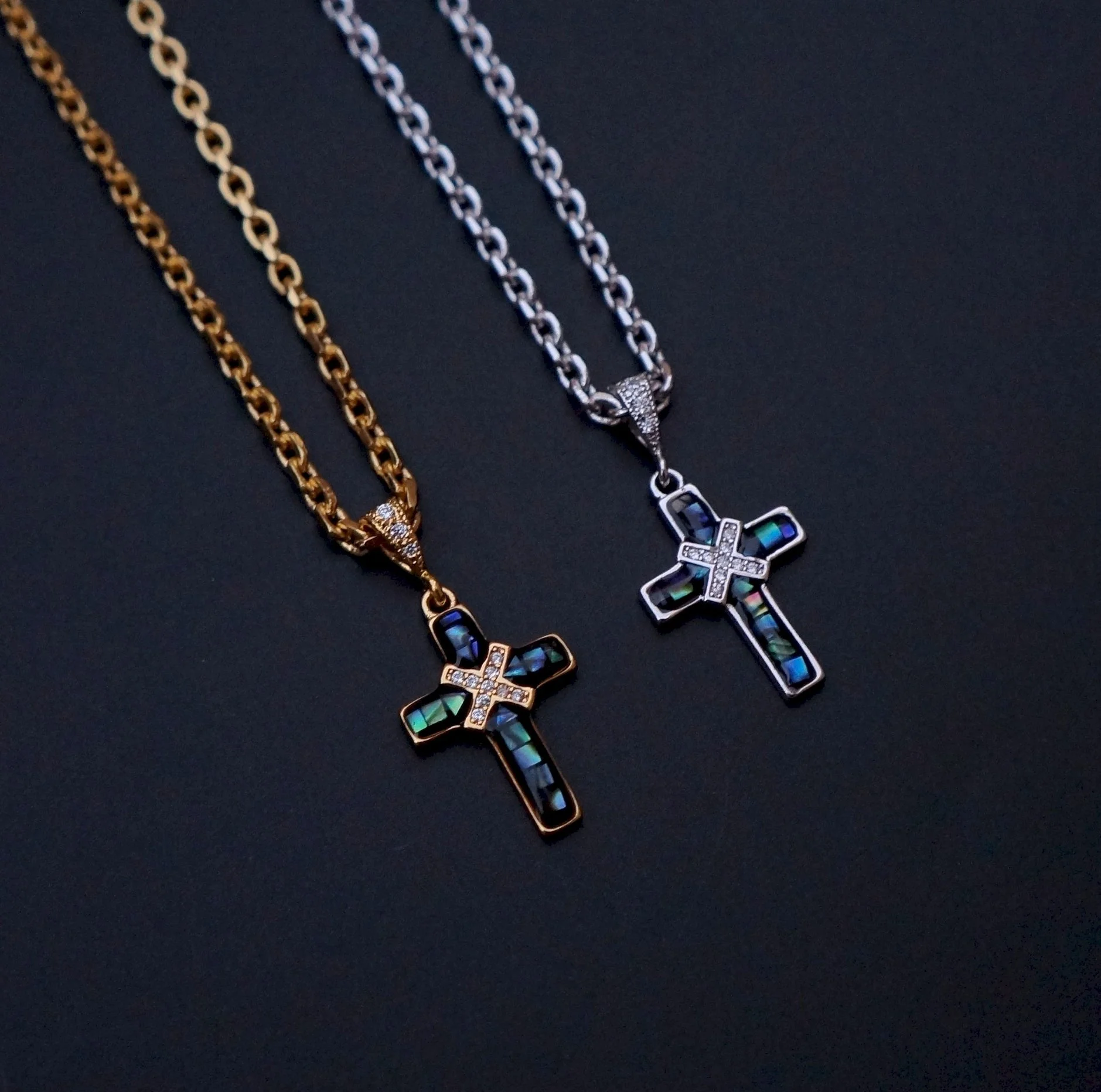 - A gorgeous cross made from abalone mosaic shell with CZ diamonds.