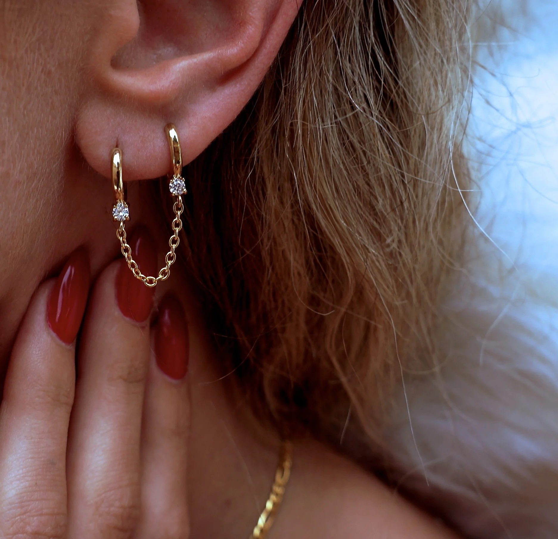 featuring 2 small 12mm gold hoops with tiny cz diamond. Attach with a delicate cable chain