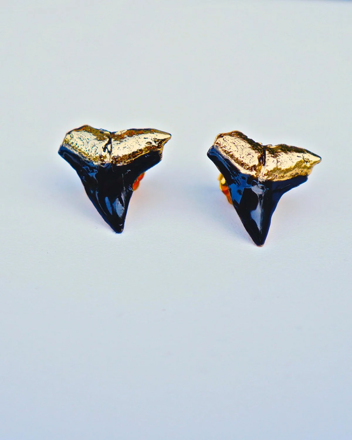 Gorgeous, large gold shark teeth earrings studs- dipped in glossy black enamel!