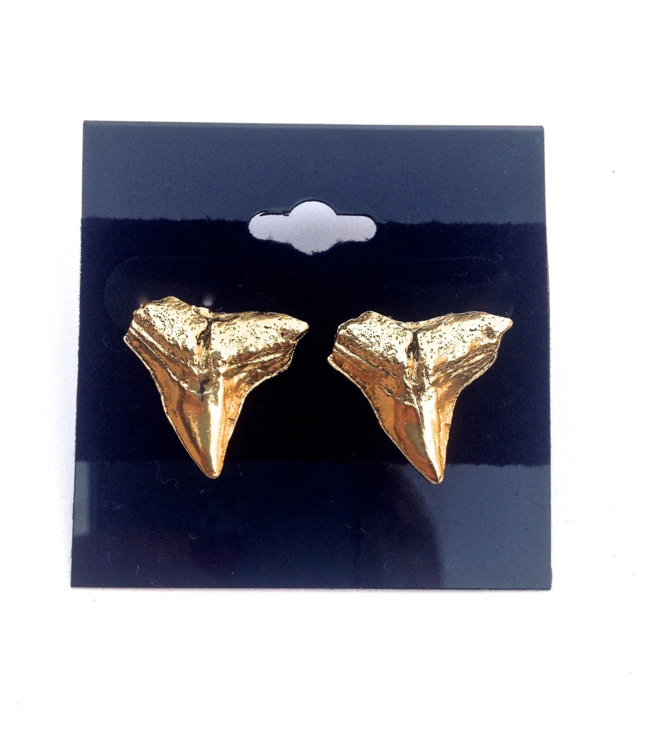 Gorgeous, large gold-plated shark teeth earrings studs! Mold was taken from an actual shark tooth!