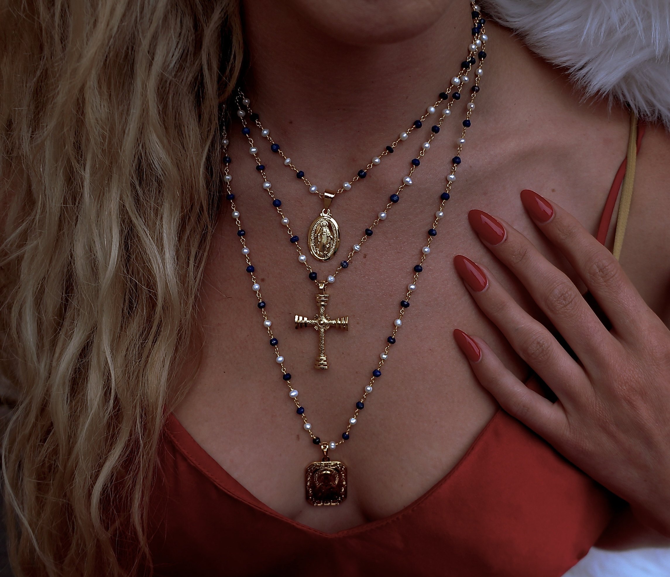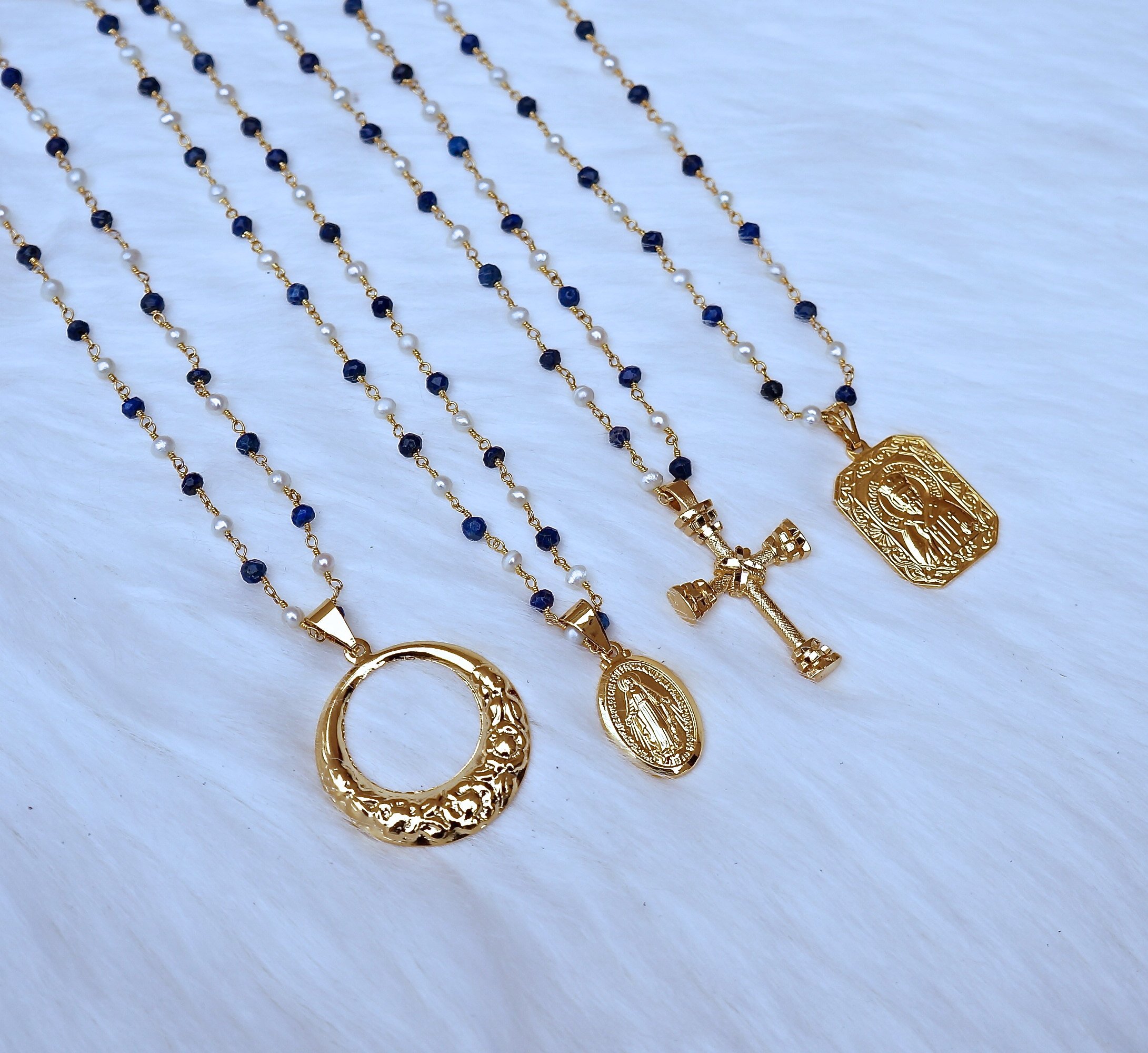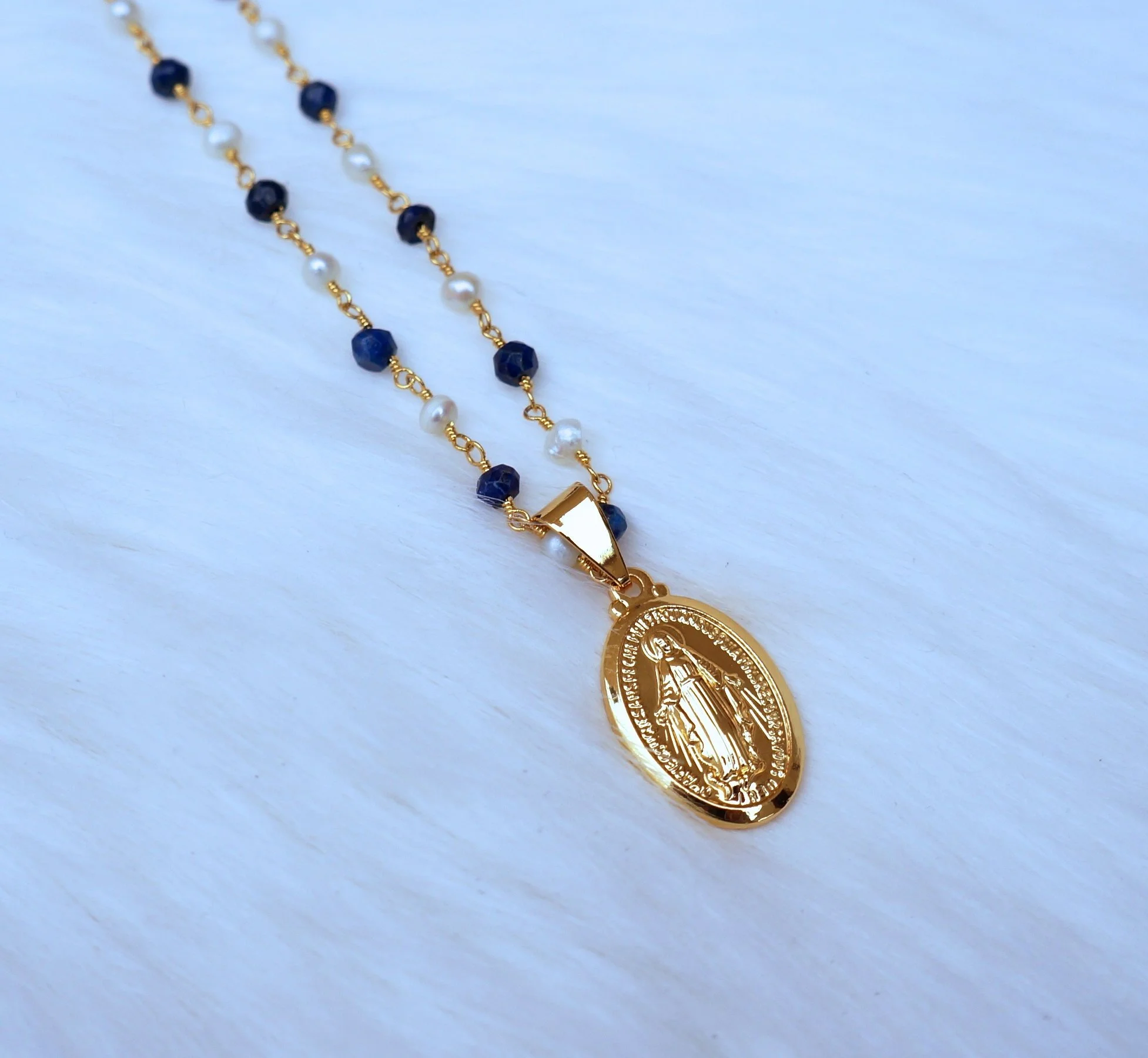Pearl/Lapis Virgin Mary Necklace