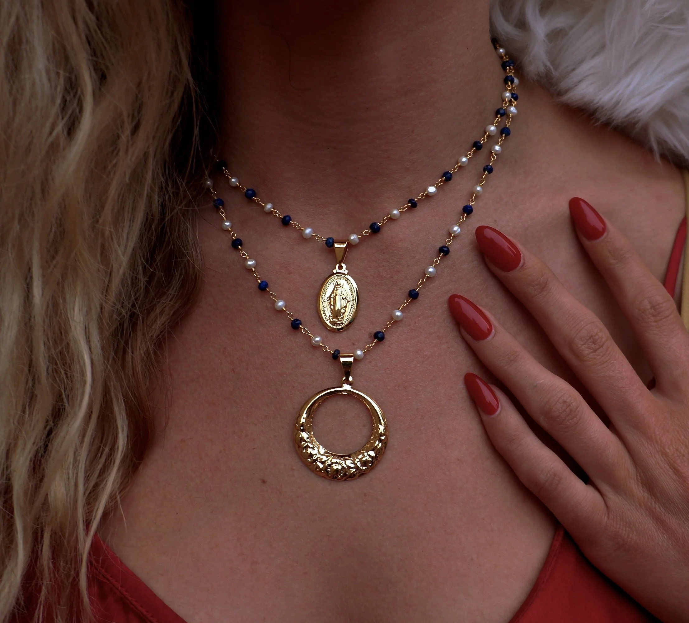 featuring a virgin mary pendant, with double-sided imagery.