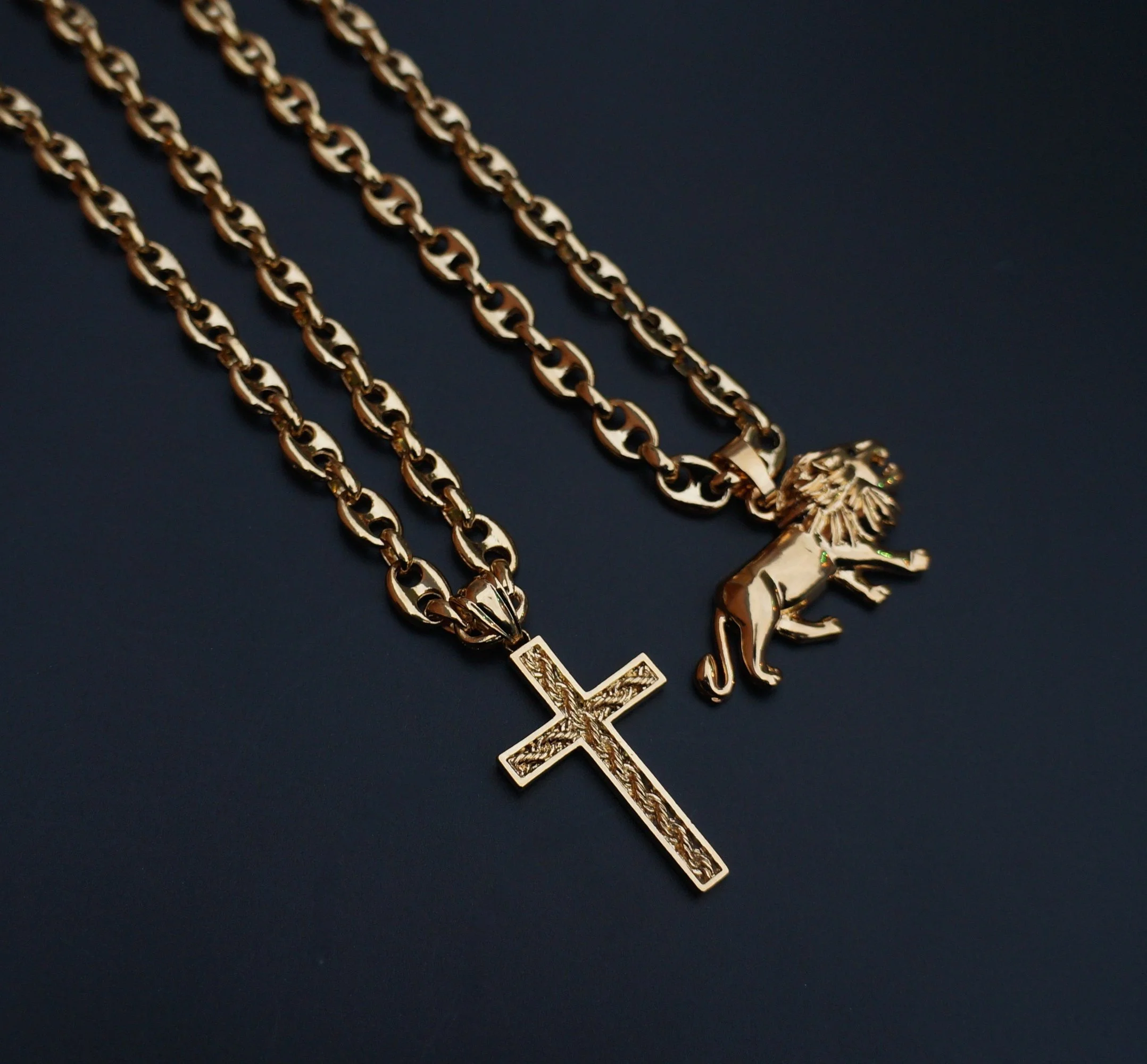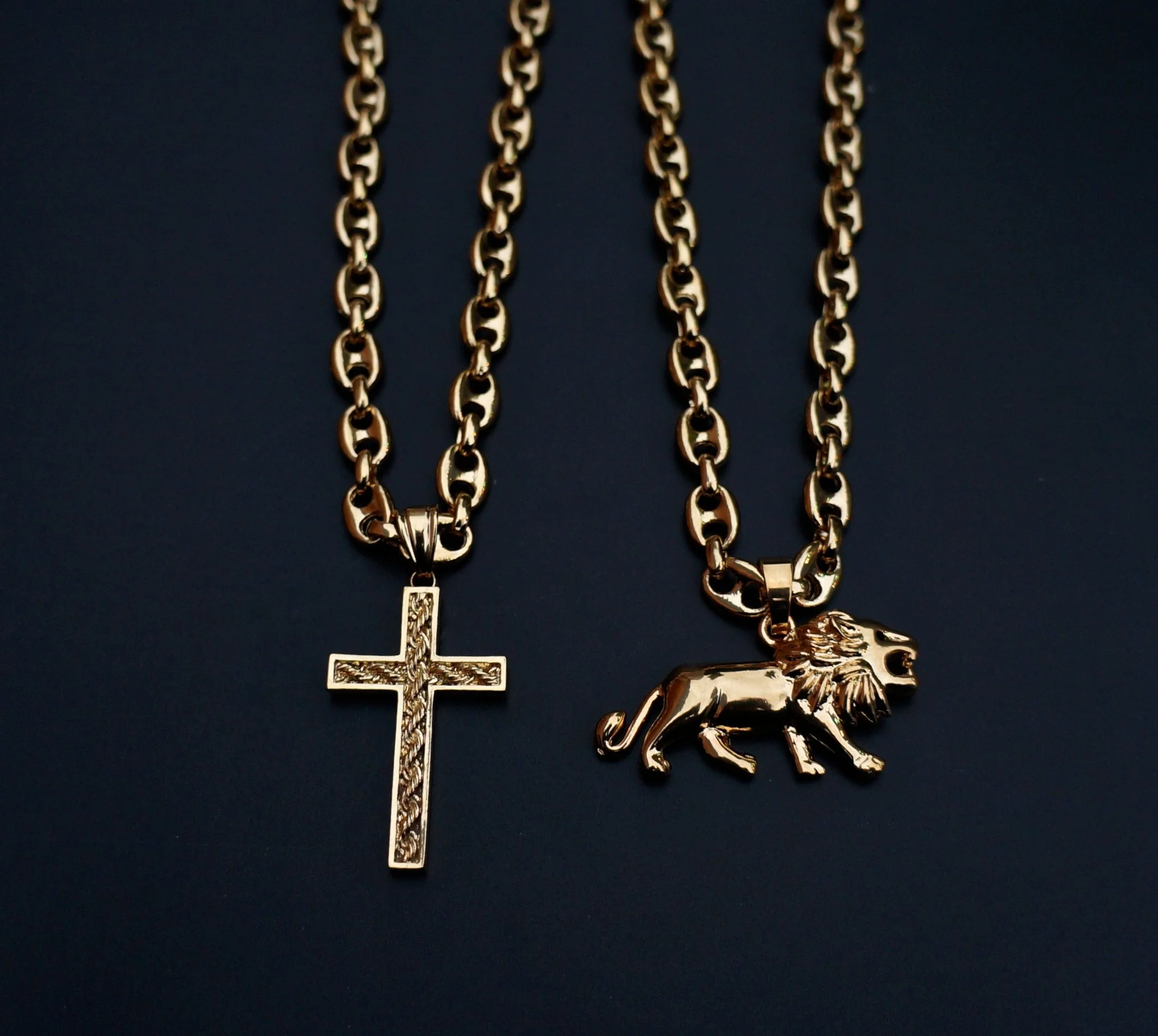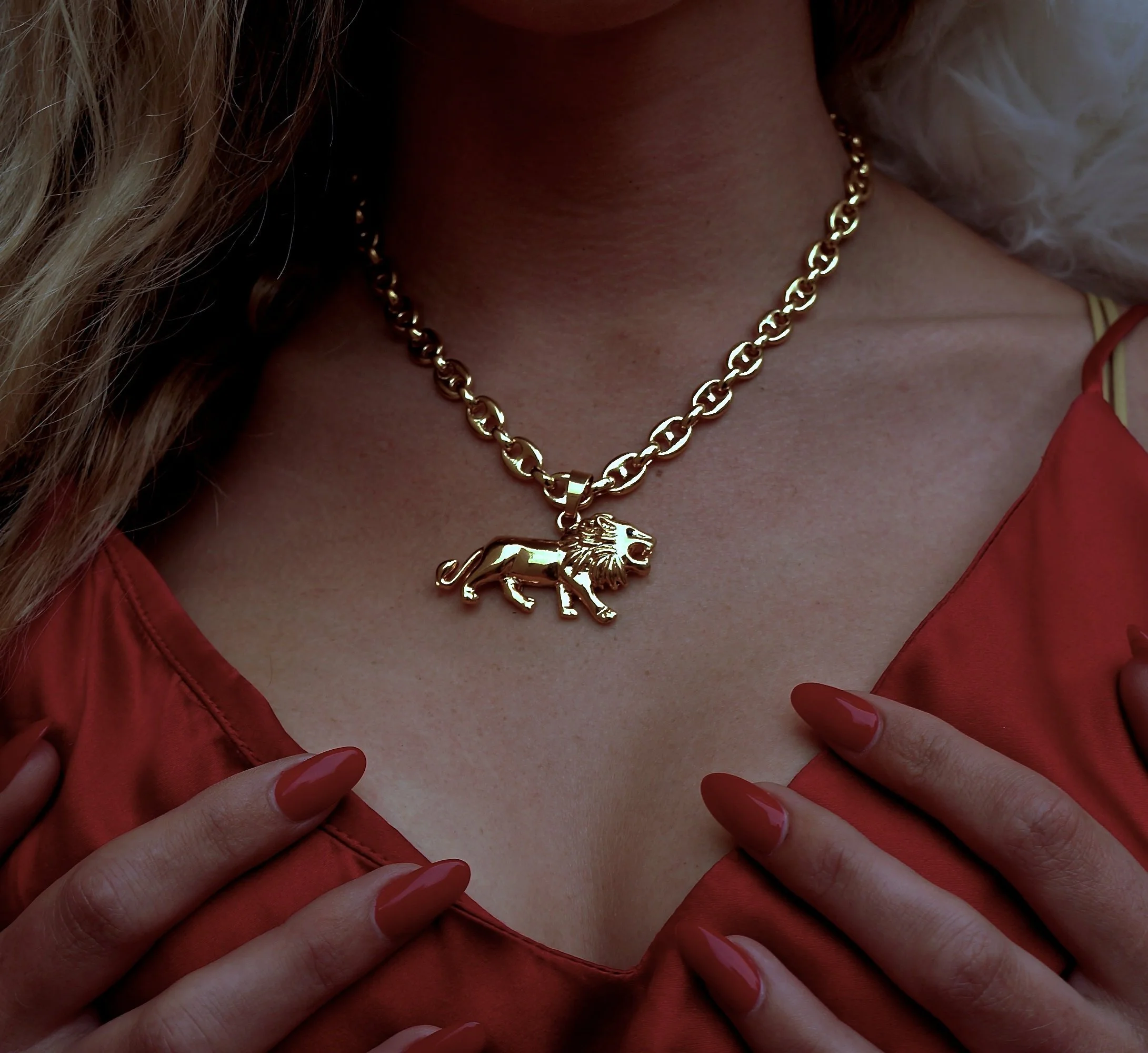 Beautiful, classic, thick, marina style link chain with a large lion.