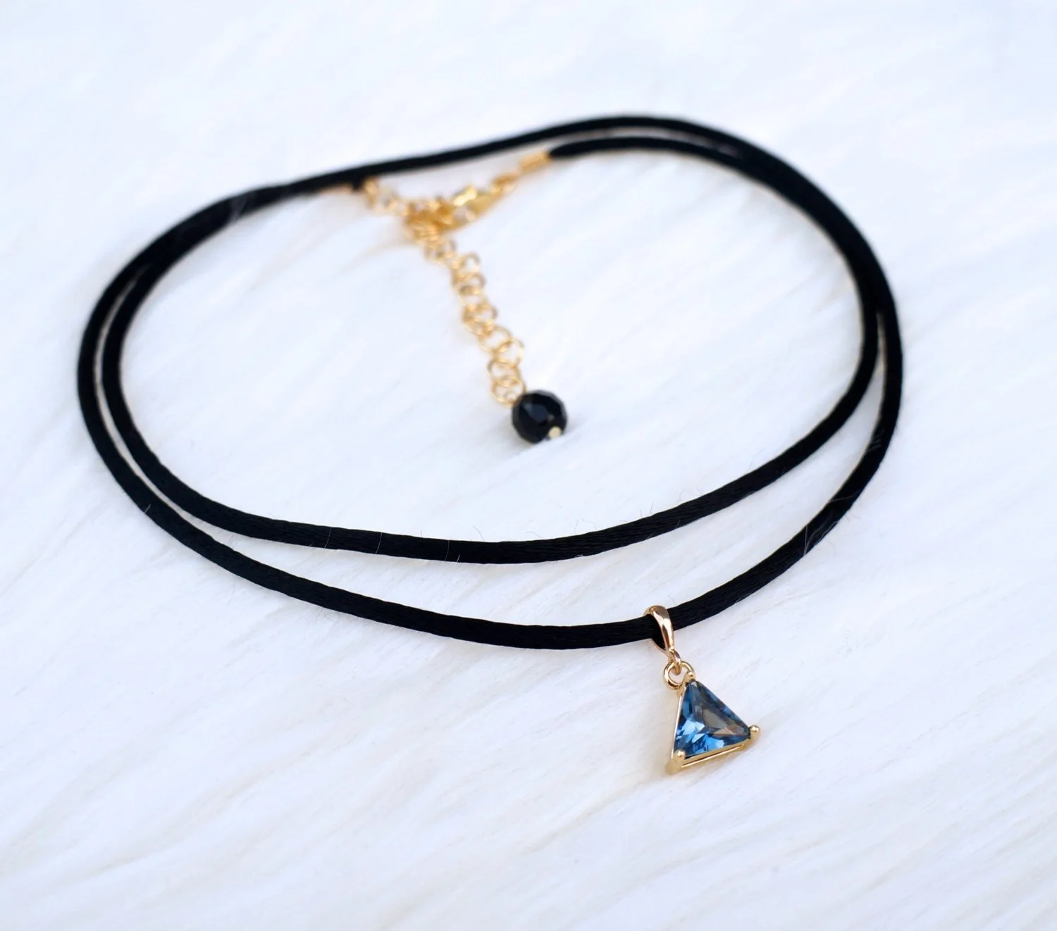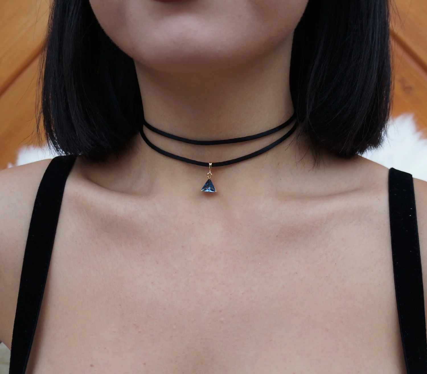 -a gorgeous, faceted, sapphire glass pyramid in a 16k gold plated prong setting. high quality. lead and nickel free. made in USA.