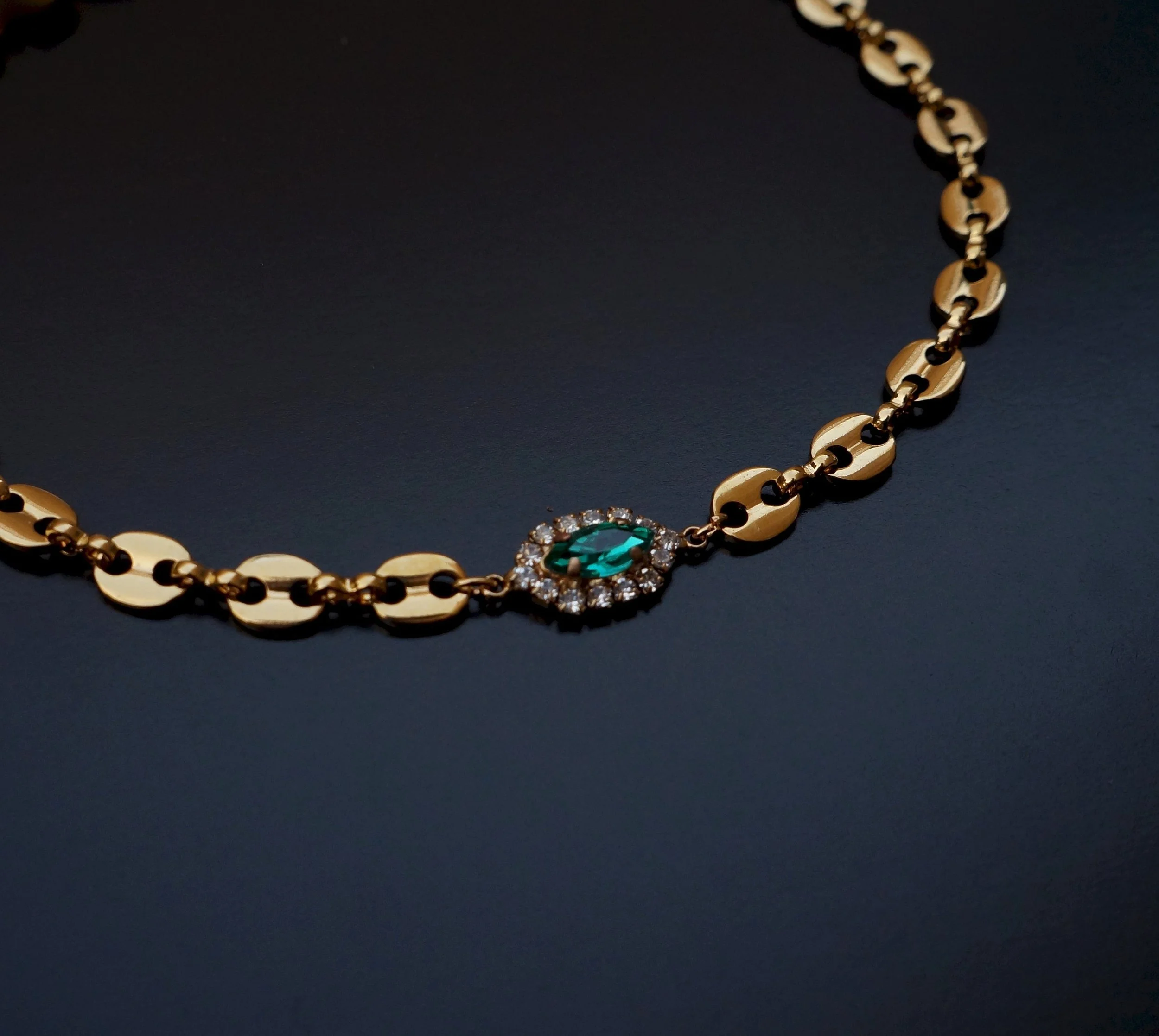 -solid, gold link gucci style chain with a sparking glass emerald connector surrounded with CZ diamonds