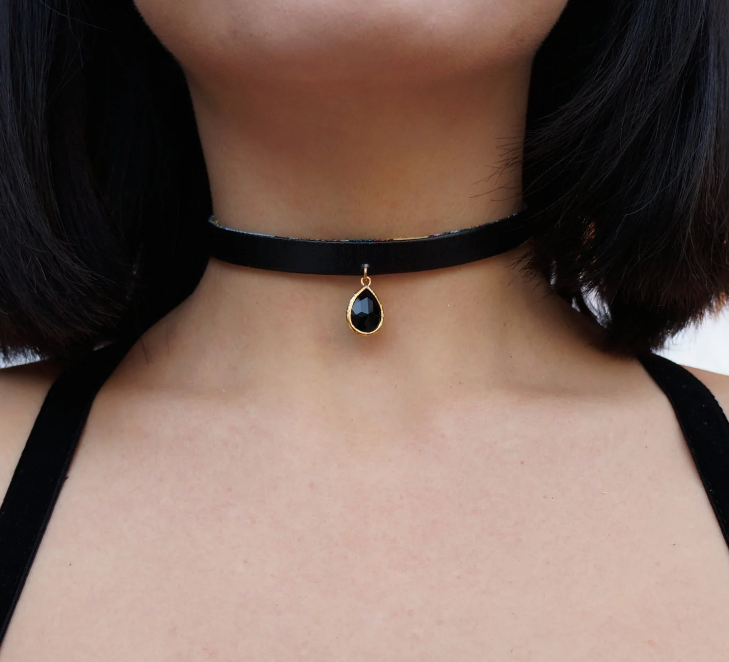 *choker measures 11.5 inches with a 3.5 extender chain with a matching, faceted, black glass drop on the end.